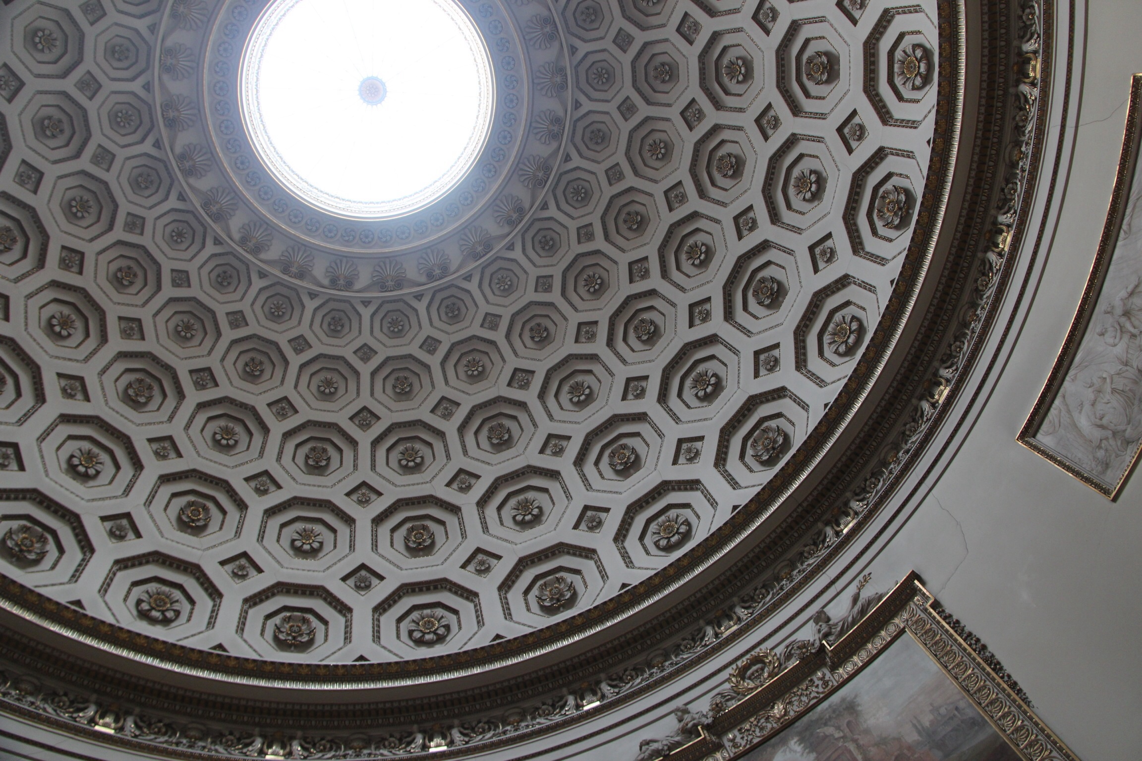 The house is a delight; a smorgasbord of fluted alabaster pillars, Italian marbled floors, and grisaille panels. Visiting first the ornate neo-classical rooms on the first floor, one begins to understand why the Hall has the alternative title of The Temple of the Arts.