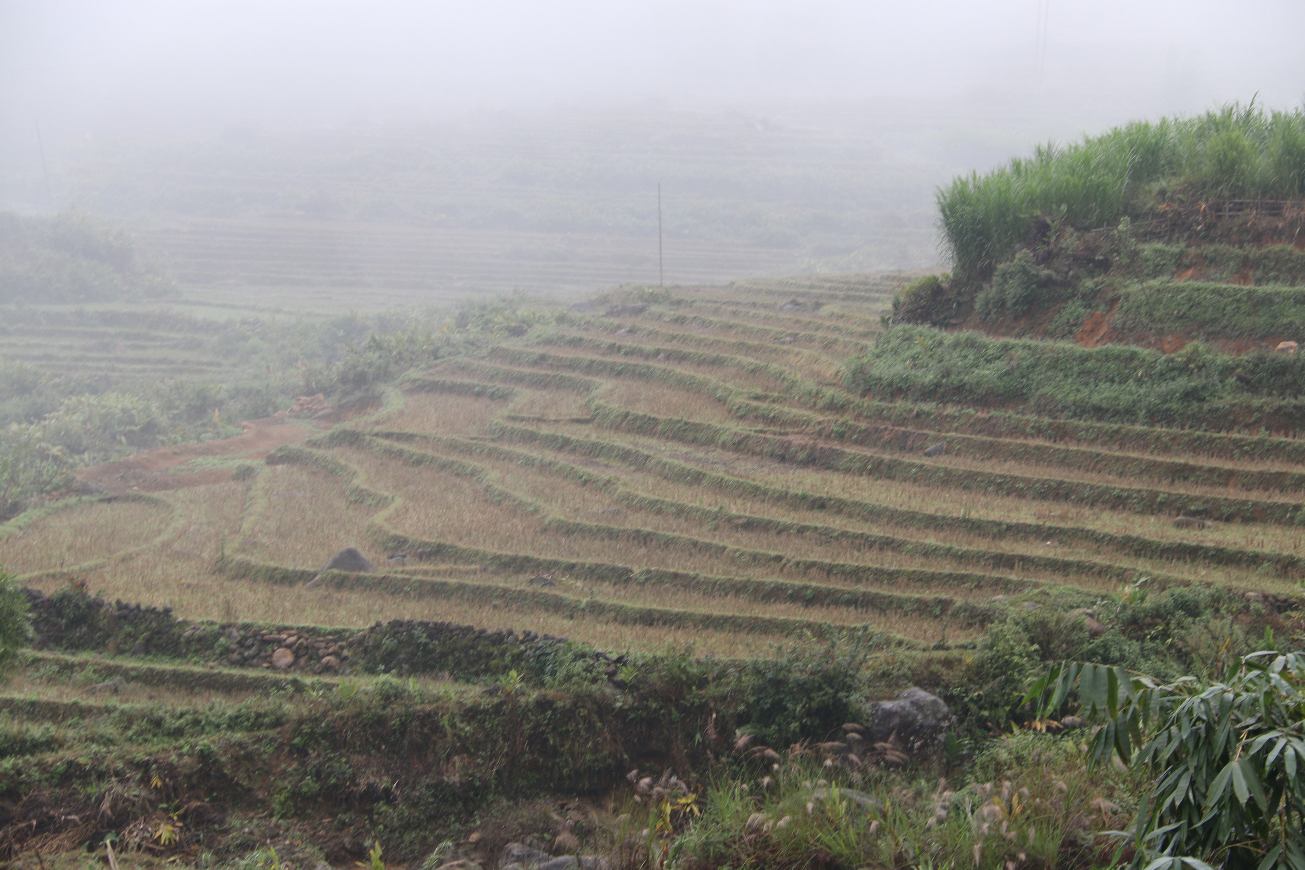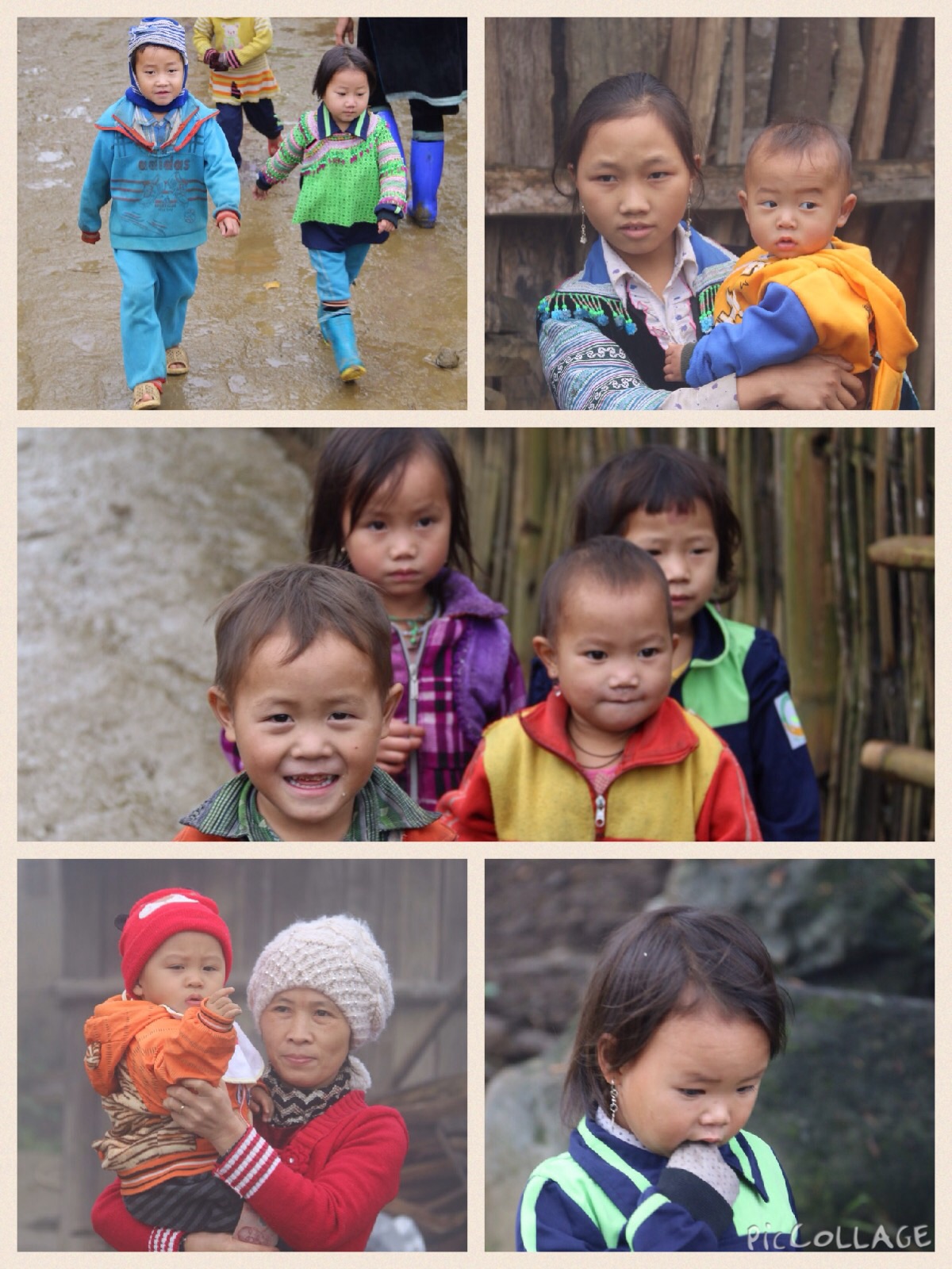 The village of Ta Giang Phinh is only 24km from Sapa, but ninety minutes by bus…almost! The torturous road is blighted by landslides and is constantly under repair. The last part of the journey is either by scooter or motorbike, crossing a fast flowing ford; or walking via a ‘wobbly’ bridge. The latter option took a further half an hour. The buildings are as simple as can be, timber planks with corrugated tin roofs. The main commerce is the once yearly rice harvest. Life is tough.